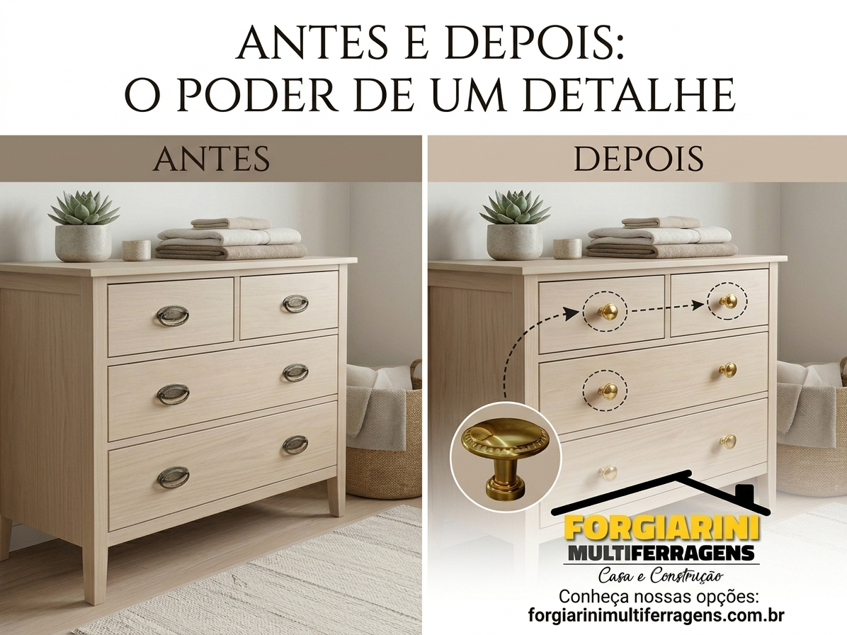 Com dobradiças novas, fechaduras, corrediças e parafusos, é possível renovar portas, móveis antigos, painéis e sistemas de guarda-roupa. Ferragens de boa qualidade garantem durabilidade, melhor fixação e segurança — e evitam rangidos, desalinhamentos ou desgaste prematuro.