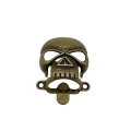 Fabricado em metal resistente, o abridor apresenta acabamento em tom ouro velho, que confere um visual envelhecido e sofisticado. Os detalhes da escultura são bem definidos, valorizando as formas da caveira e reforçando a estética rústica e vintage.